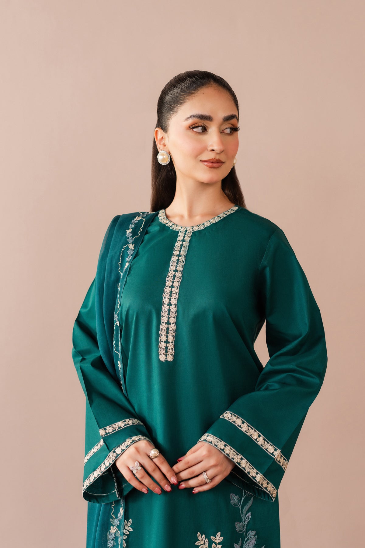 Make a graceful statement in this green lawn dress, crafted for effortless sophistication. The soft, breathable fabric ensures all-day comfort, while the rich hue adds depth and elegance to your look. Complemented by a beautifully coordinated dupatta, the ensemble exudes timeless charm with a modern edge. Perfect for daytime gatherings or festive evenings, this piece blends tradition and contemporary style with understated refinement.