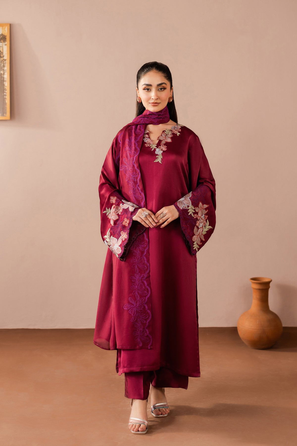 Indulge in timeless allure with this deep maroon silk dress, crafted to radiate elegance and confidence. The rich wine-toned hue enhances the smooth, lustrous silk, creating a look that feels both regal and refined. Paired with a delicately draped dupatta, the ensemble flows gracefully with every step. Perfect for festive evenings and intimate celebrations, it captures warmth, depth, and effortless sophistication in one striking silhouette.