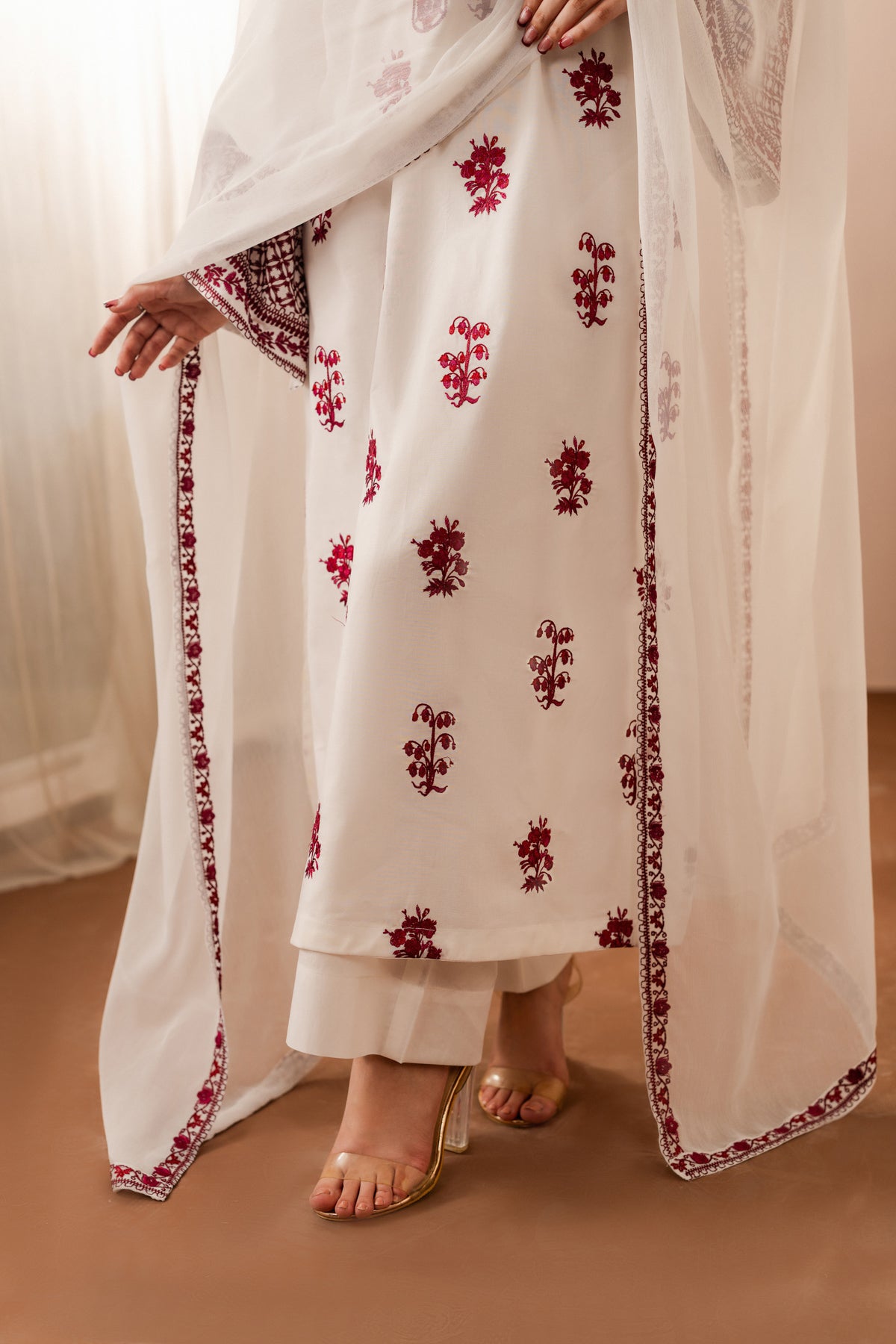Exude effortless grace in this white lawn dress adorned with rich maroon embroidery. The crisp white base offers a fresh, timeless appeal, while the intricate maroon detailing adds depth and festive charm. Crafted from lightweight, breathable lawn for all-day comfort, it is paired with a beautifully coordinated dupatta that completes the elegant silhouette. Perfect for daytime gatherings or celebratory moments, this ensemble blends classic contrast with refined sophistication.
