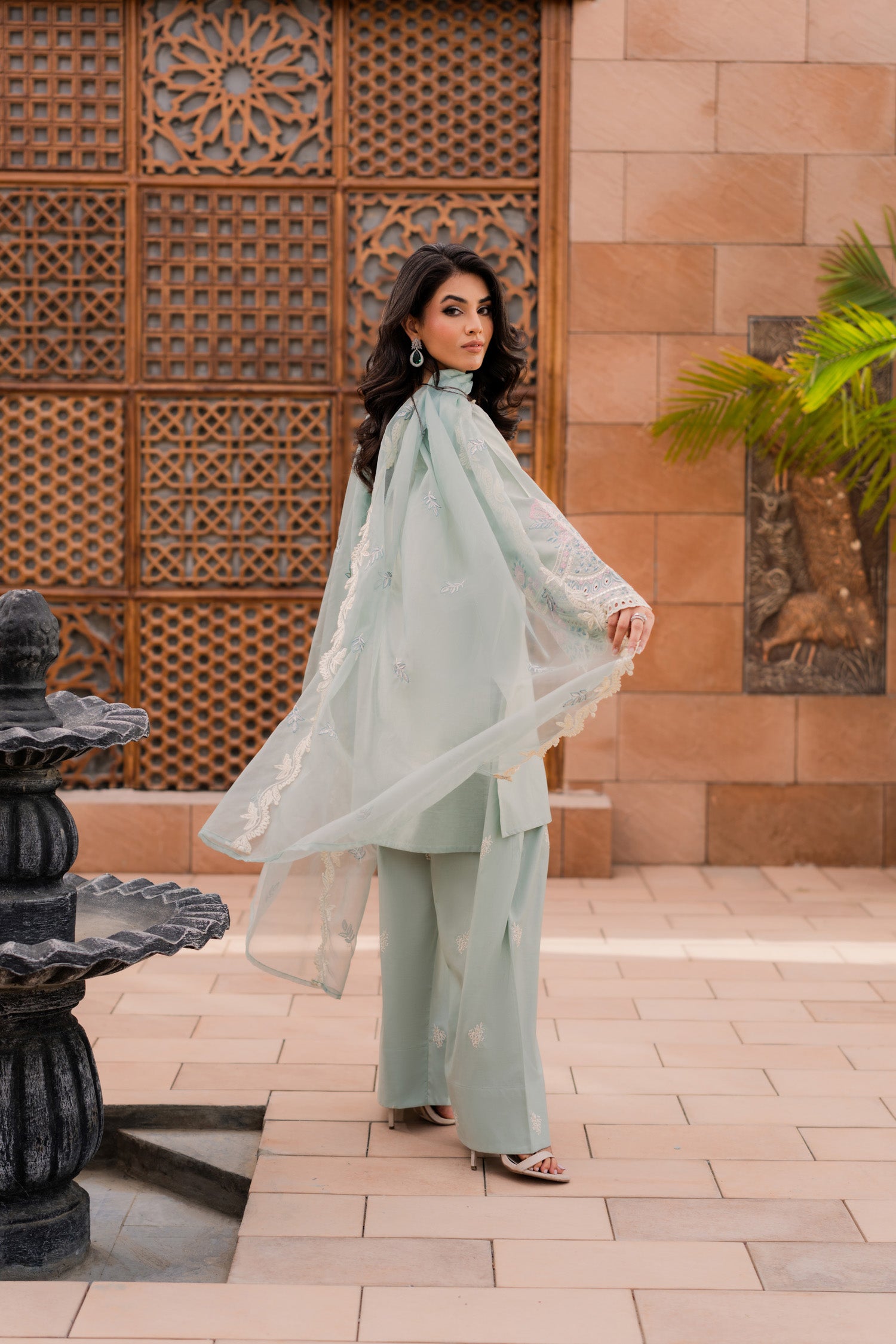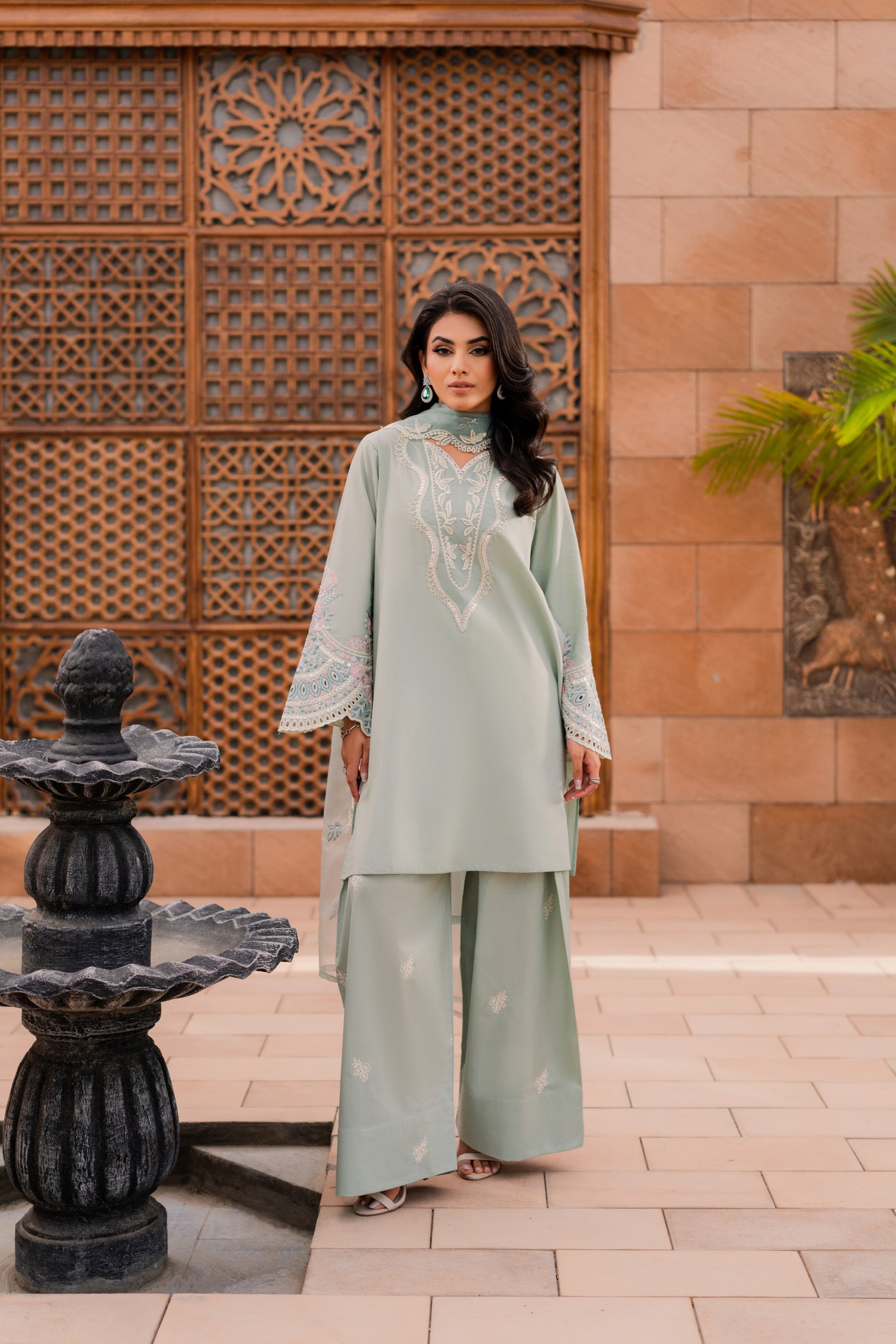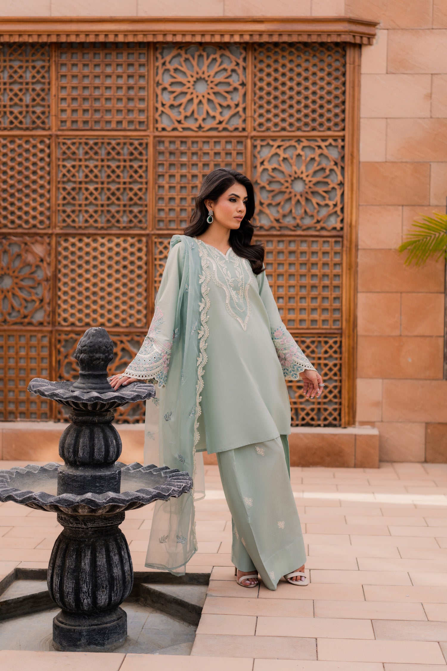 Step into subtle luxury with this light pistachio embroidered suit, a refreshing take on elegance. Delicately adorned with intricate embroidery, it radiates softness and charm. Perfect for daytime celebrations or intimate gatherings, this suit blends serenity with sophistication—crafted for the woman who embraces grace in every thread and hue.