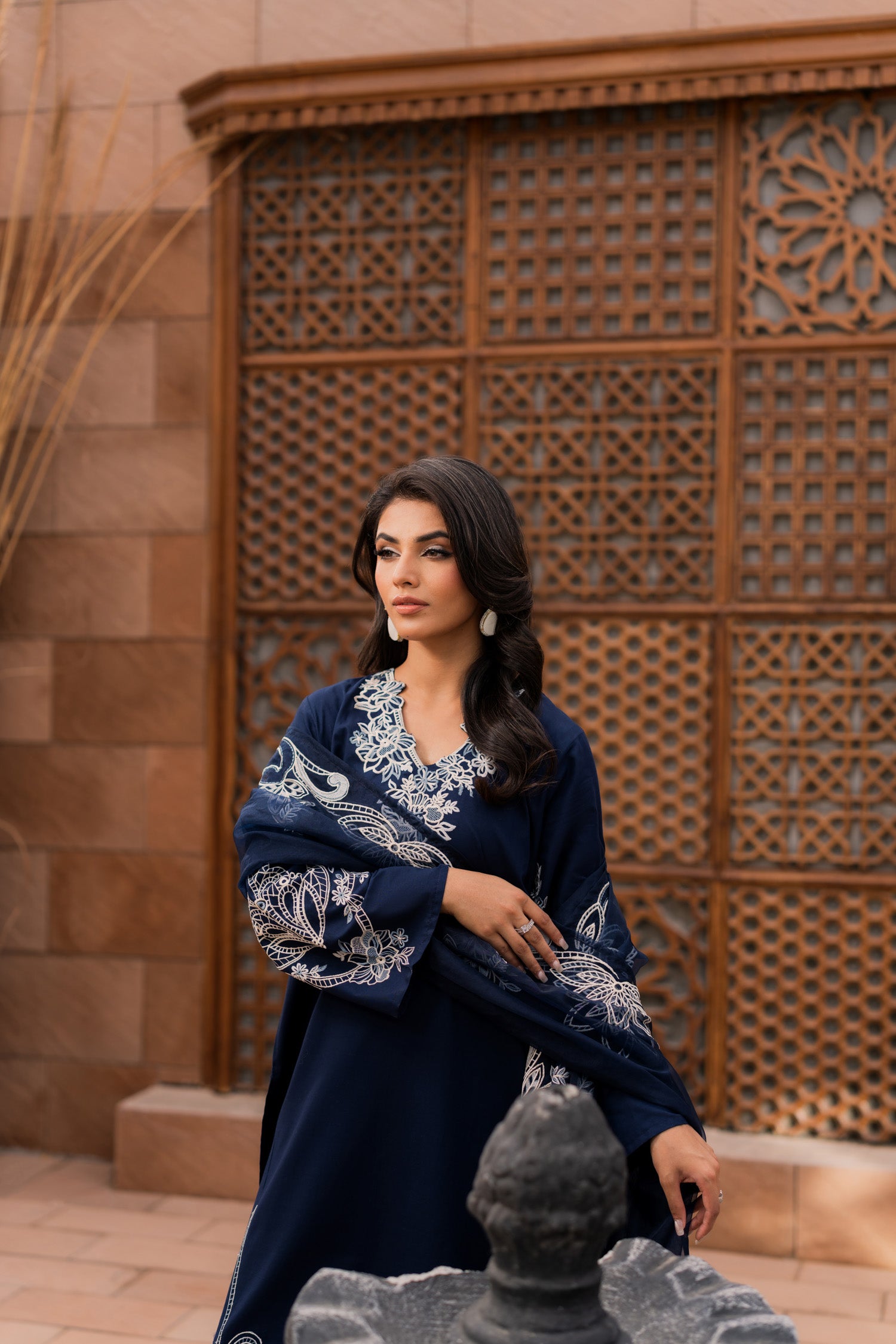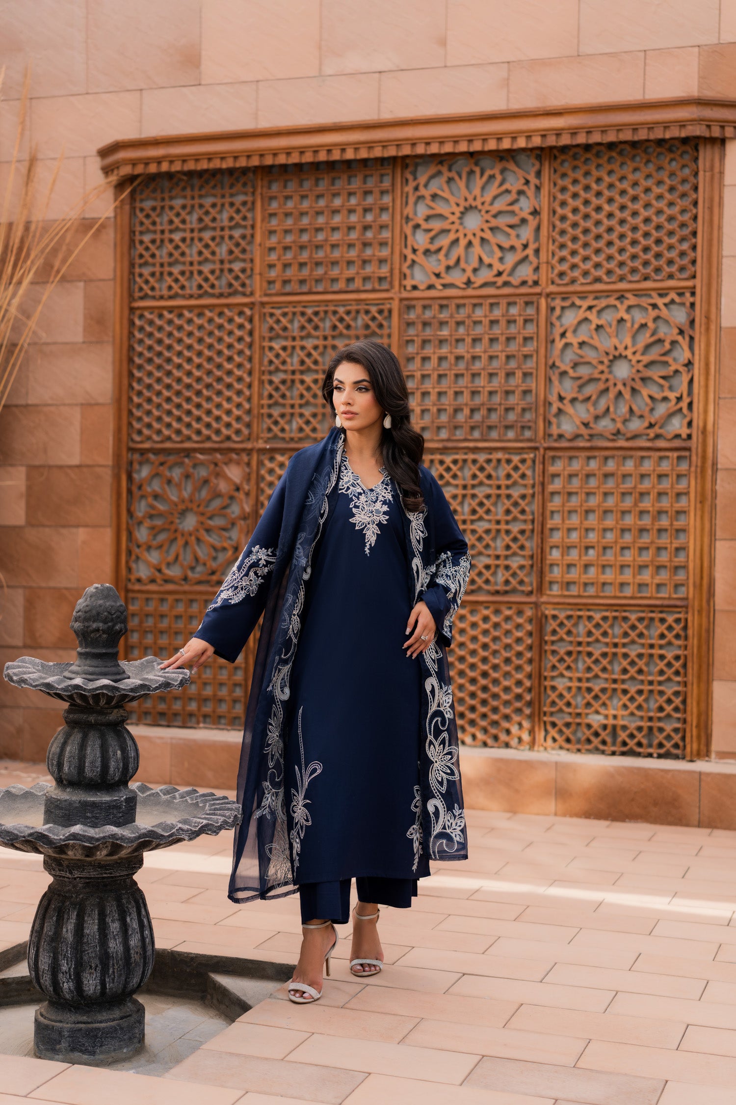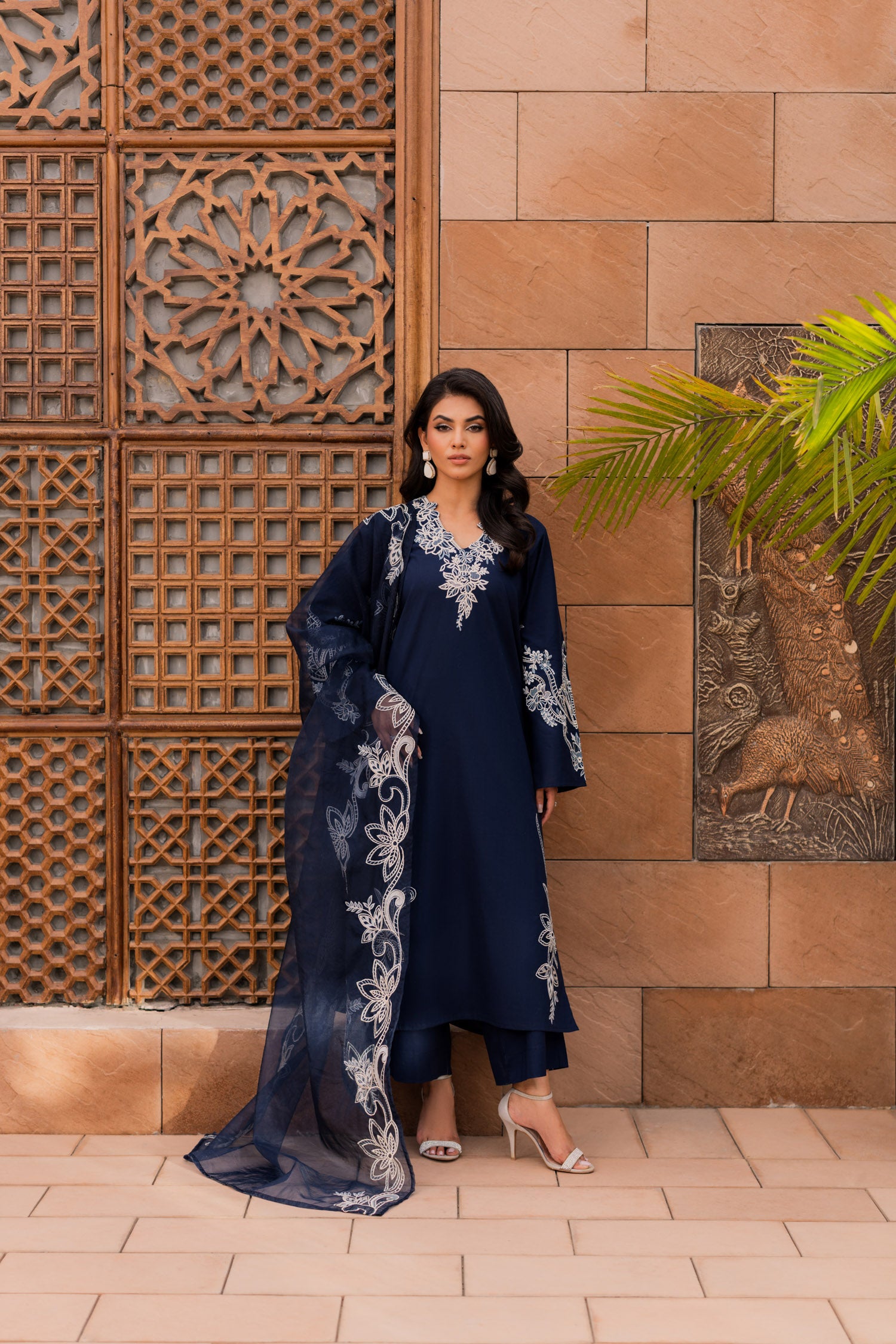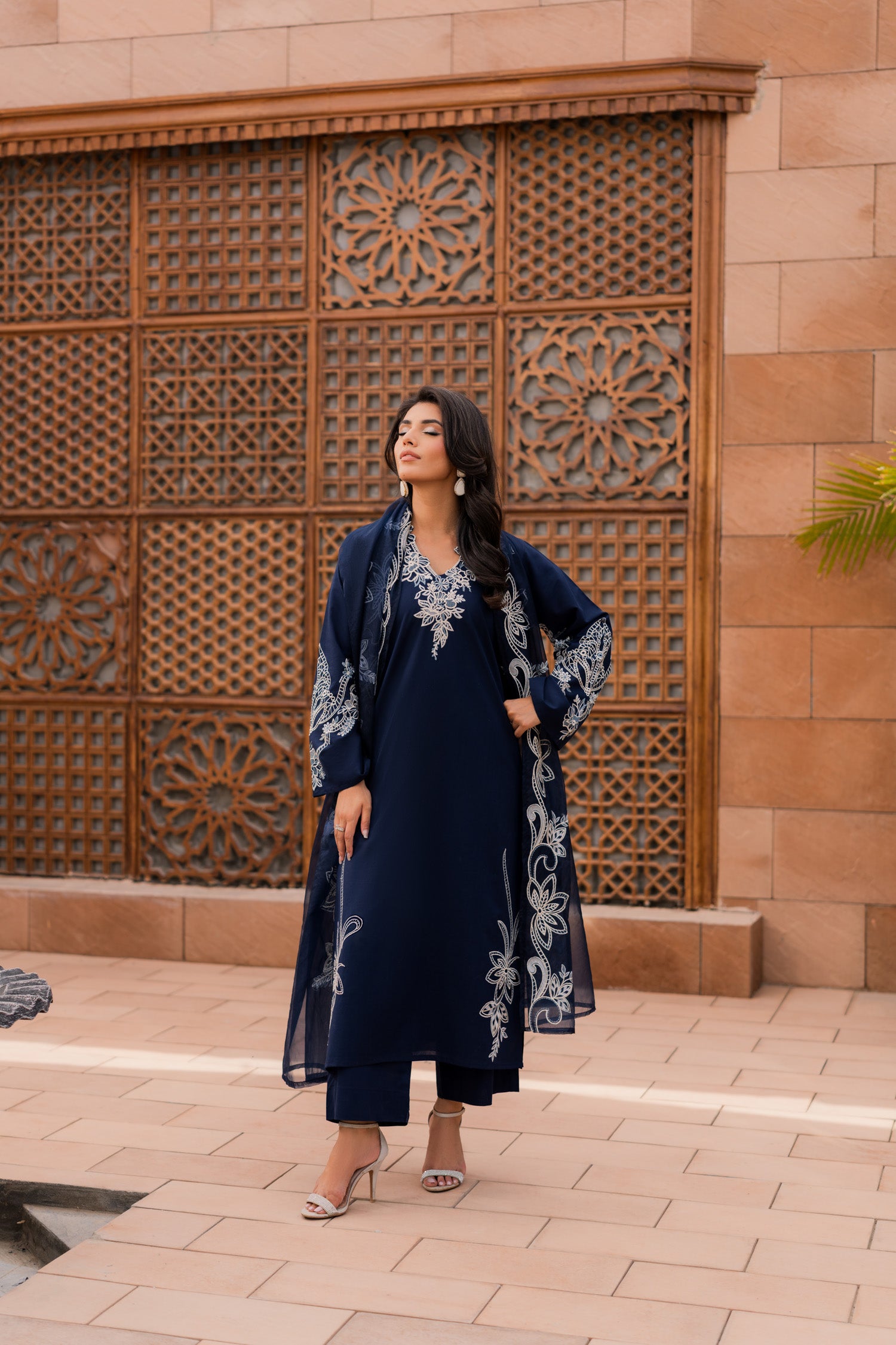 Make a statement in this dark blue embroidered suit, where deep hues meet intricate artistry. The rich fabric, adorned with elegant embroidery, exudes power and poise. Perfect for evening soirees or grand celebrations, this timeless piece is designed for the woman who carries confidence like a second skin.