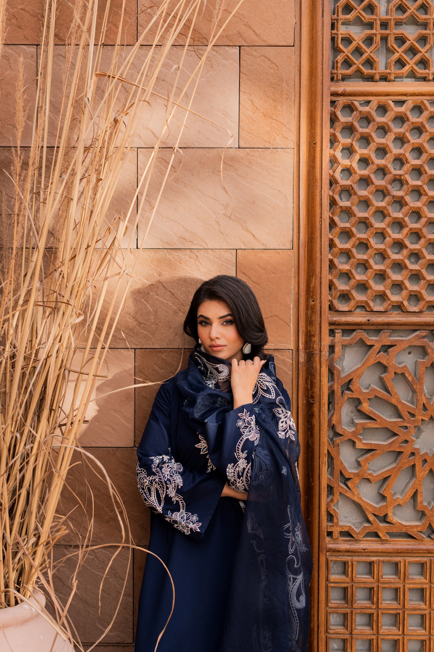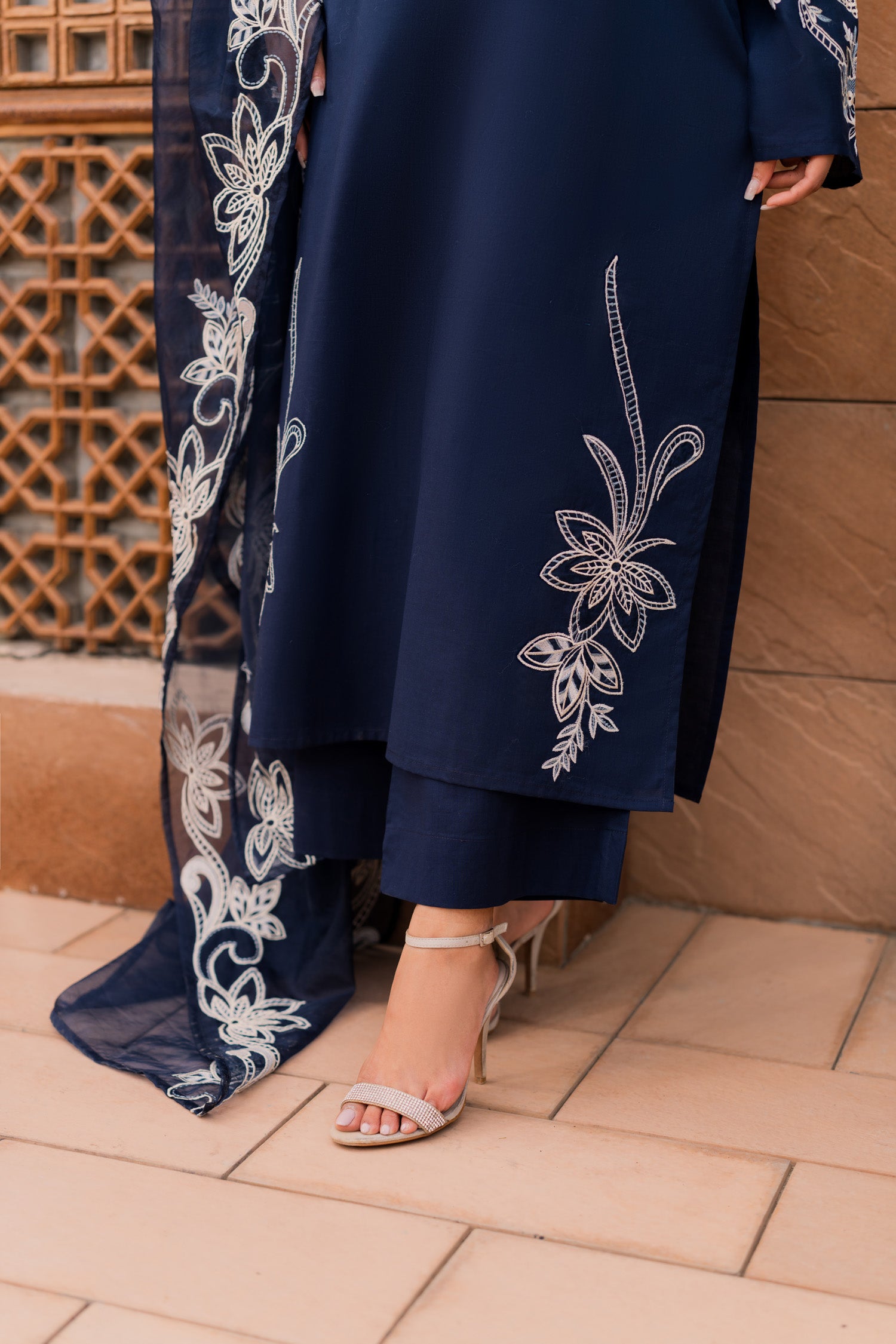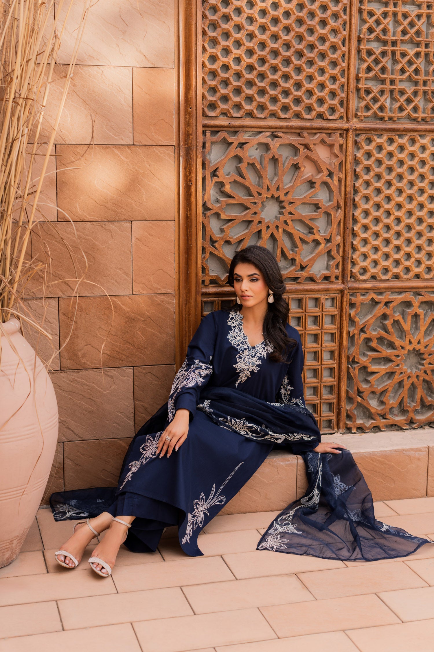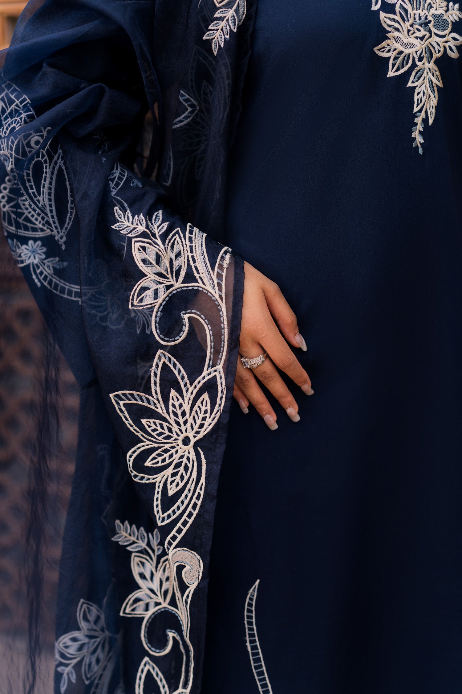 Make a statement in this dark blue embroidered suit, where deep hues meet intricate artistry. The rich fabric, adorned with elegant embroidery, exudes power and poise. Perfect for evening soirees or grand celebrations, this timeless piece is designed for the woman who carries confidence like a second skin.
