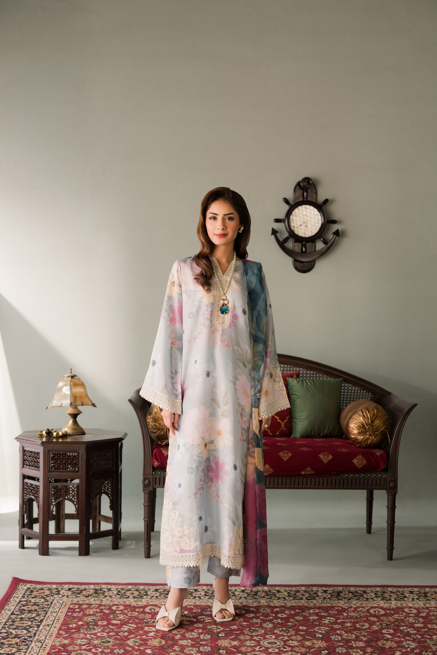 This light blue floral printed embroidered suit features delicate floral patterns on luxurious Blended lawn fabric, offering both comfort and elegance. The intricate embroidery adds a refined touch, while the matching chiffon printed dupatta enhances the look.