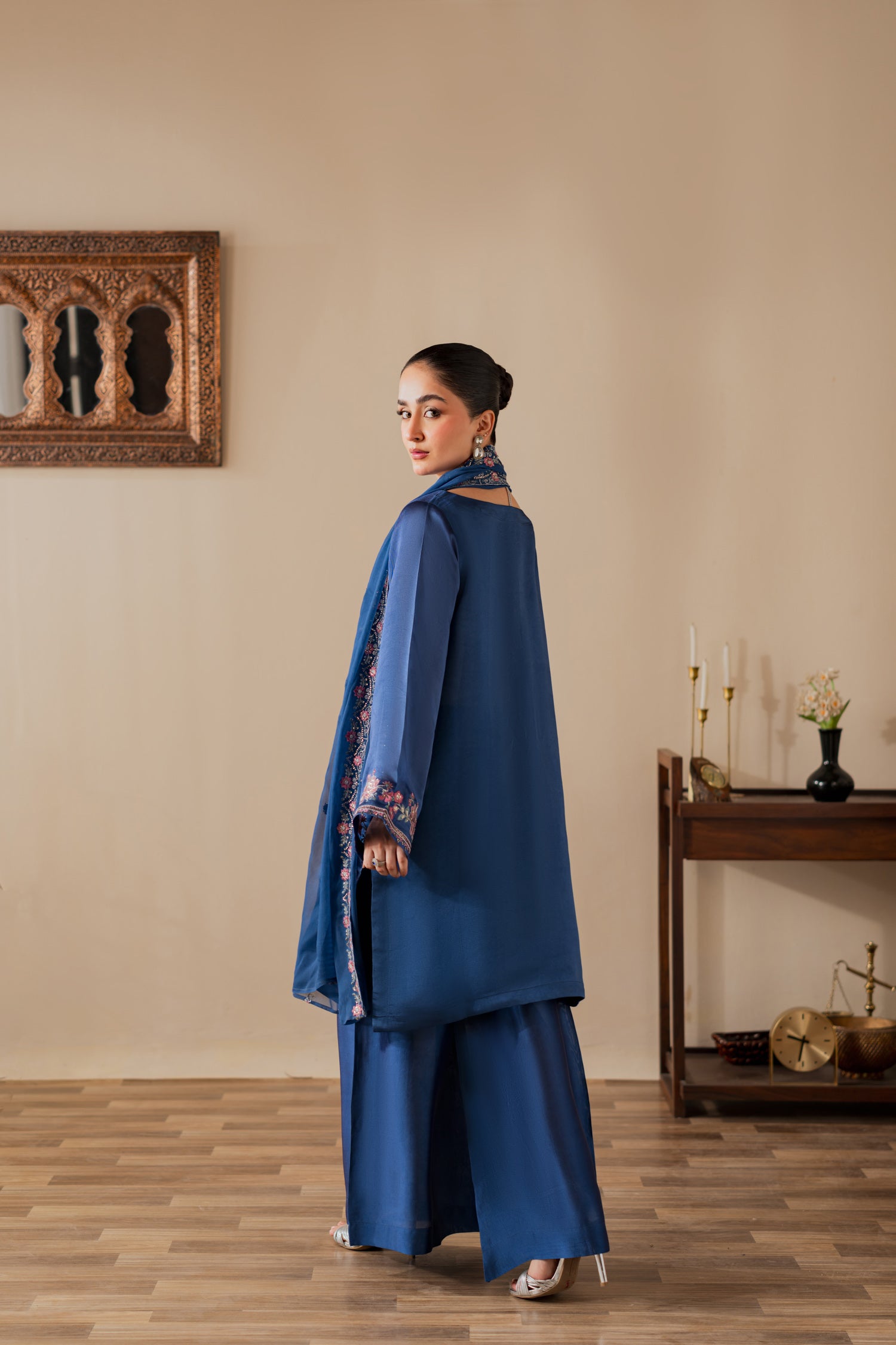 Draped in the luminous charm of blue sheesha silk, this ensemble radiates refined opulence. Delicate embroidery shimmers across its glossy surface, capturing light with every movement. Paired with a flowing chiffon dupatta, it embodies effortless sophistication — a statement of timeless grace for the modern, elegant woman.