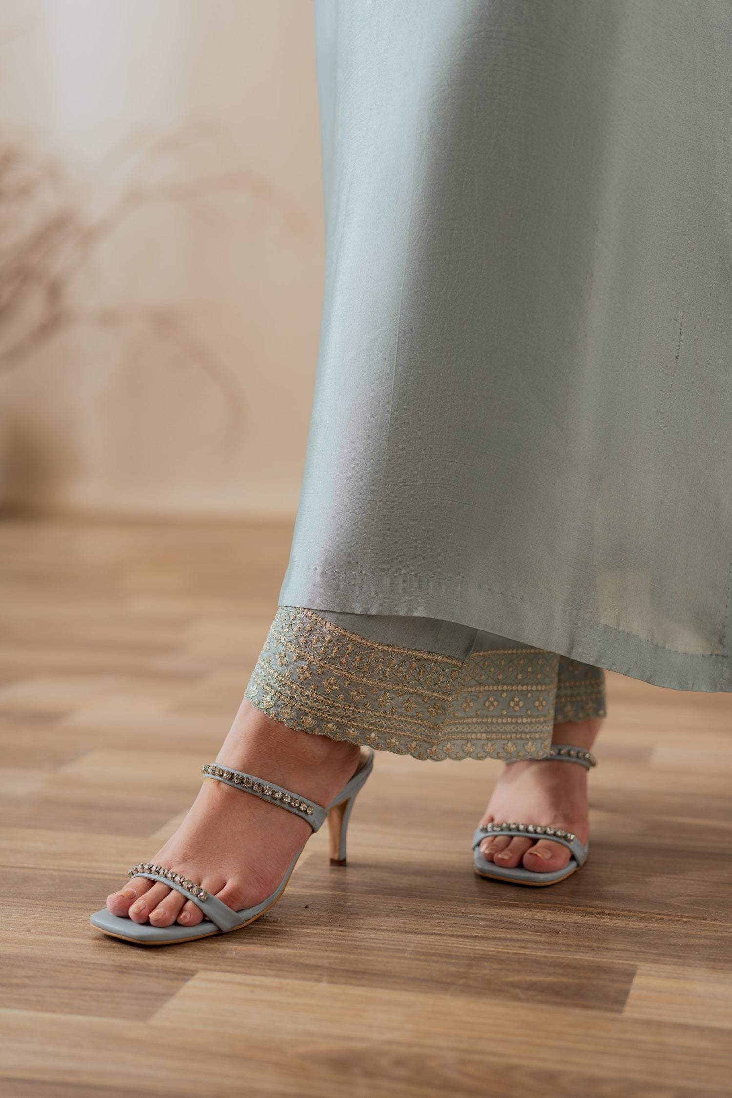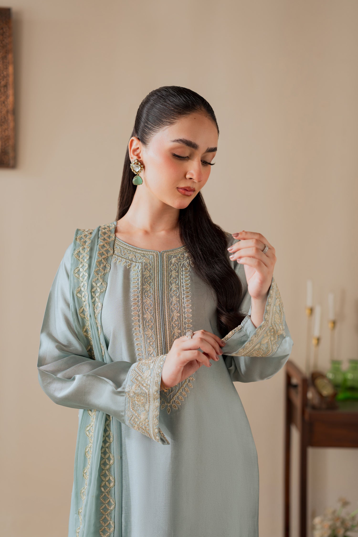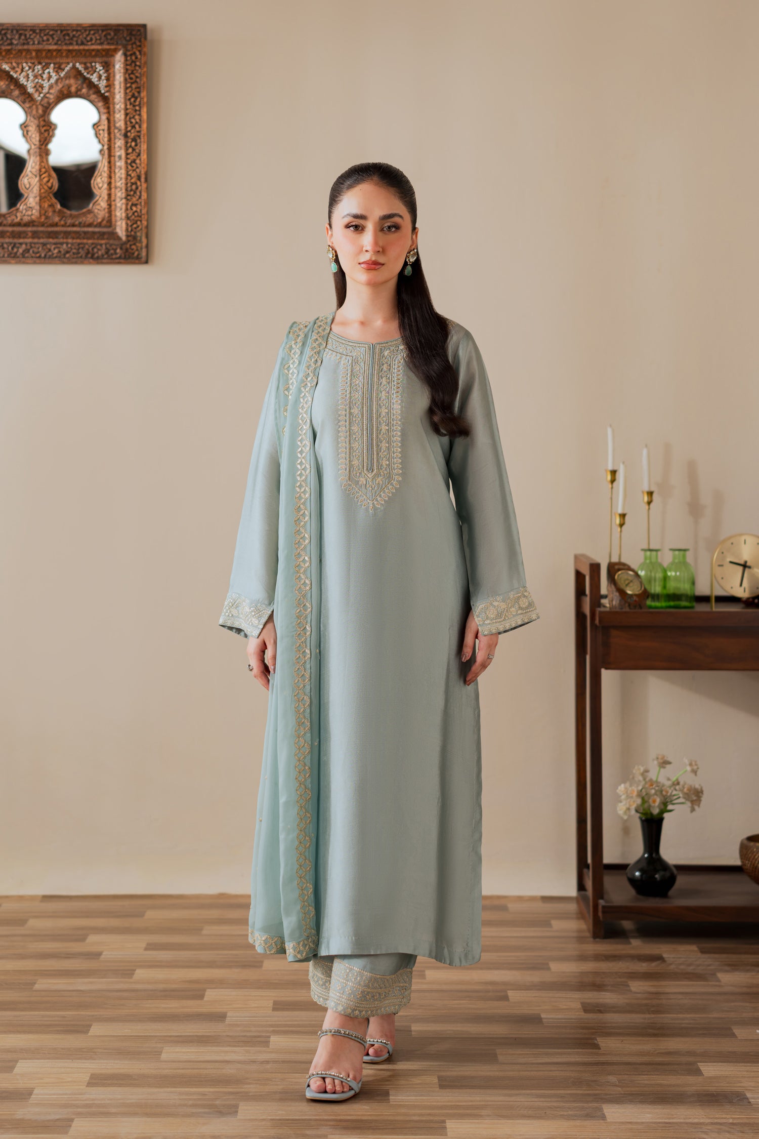 Draped in the luminous charm of ice blue sheesha silk, this ensemble radiates refined opulence. Delicate embroidery shimmers across its glossy surface, capturing light with every movement. Paired with a flowing chiffon dupatta, it embodies effortless sophistication — a statement of timeless grace for the modern, elegant woman.