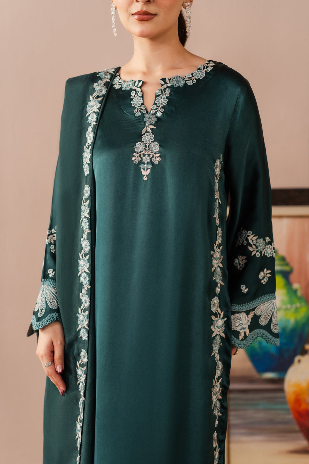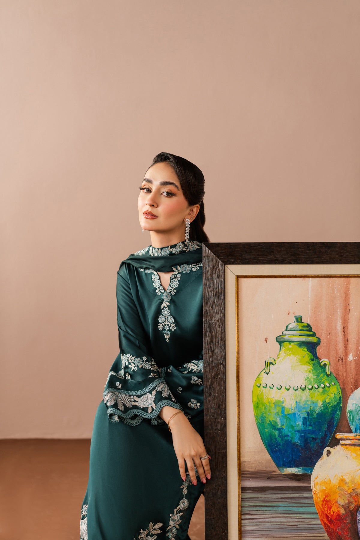 Make a striking statement in this emerald silk dress, where rich color meets refined elegance. The lustrous silk fabric drapes beautifully, enhancing the depth of the dark green hue with every movement. Paired with a flowing dupatta, the ensemble exudes grace and sophistication. Perfect for festive evenings and special celebrations, this piece captures timeless charm while offering a bold, regal presence.