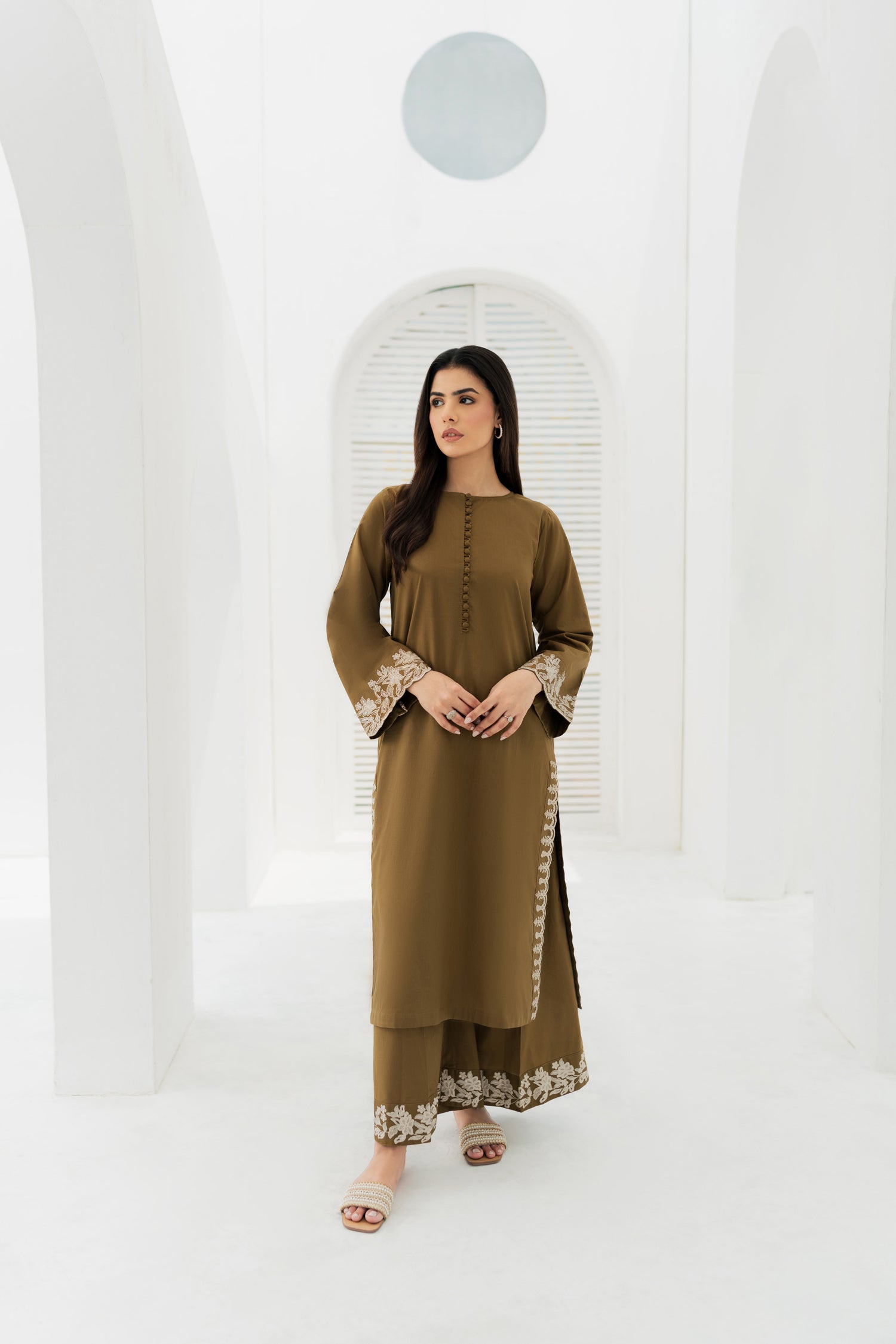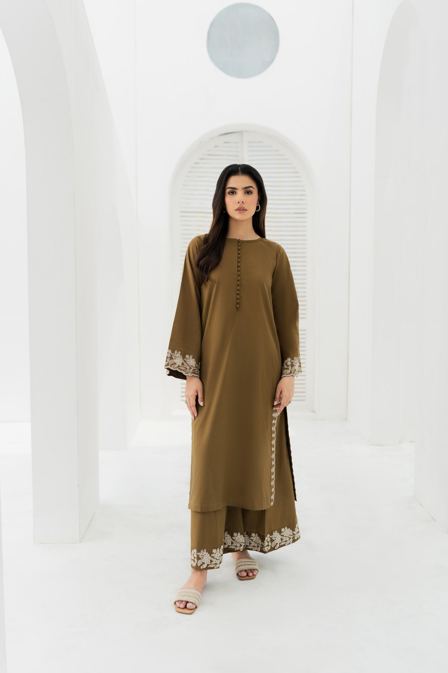 Refined olive-green embroidered suit in cozy Khaddar, blending earthy elegance with winter warmth. A timeless choice for graceful style.