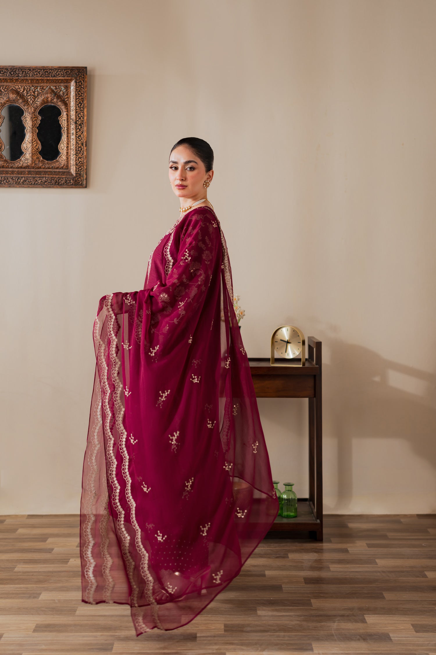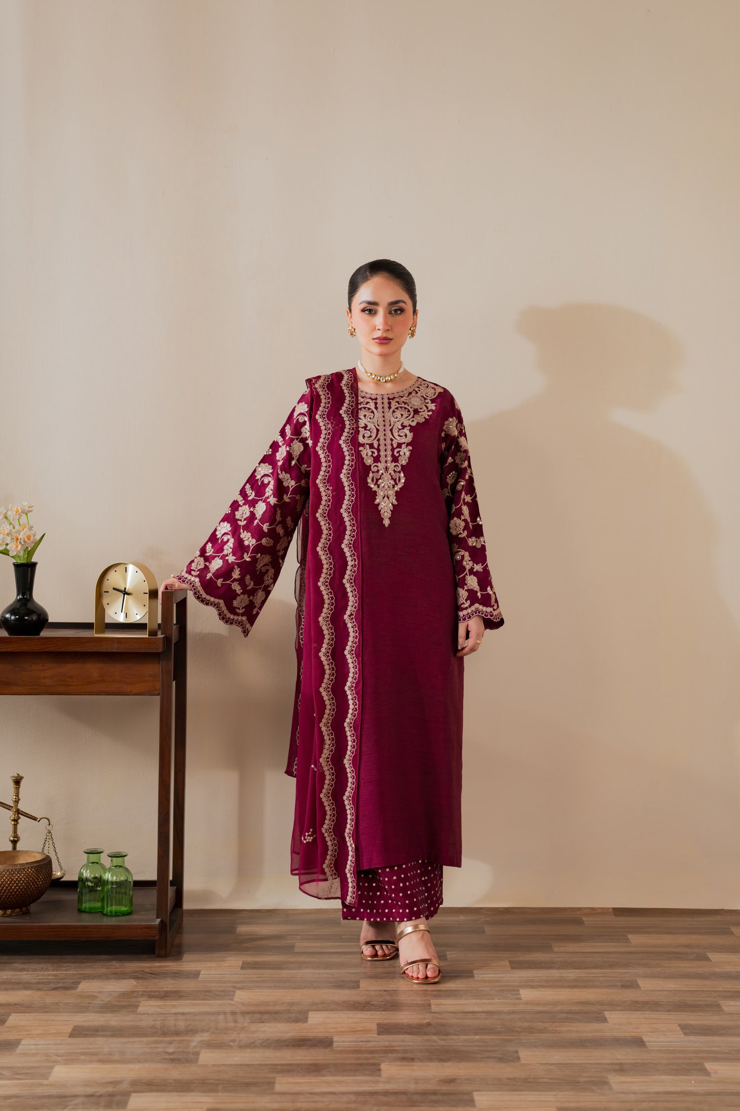 Drenched in deep maroon allure, this raw silk ensemble embodies regal sophistication. Intricate embroidery shimmers across its rich texture, capturing timeless artistry. The lightweight chiffon dupatta adds a touch of fluid grace, making it a perfect statement for evening soirées and festive elegance with a modern, refined charm.