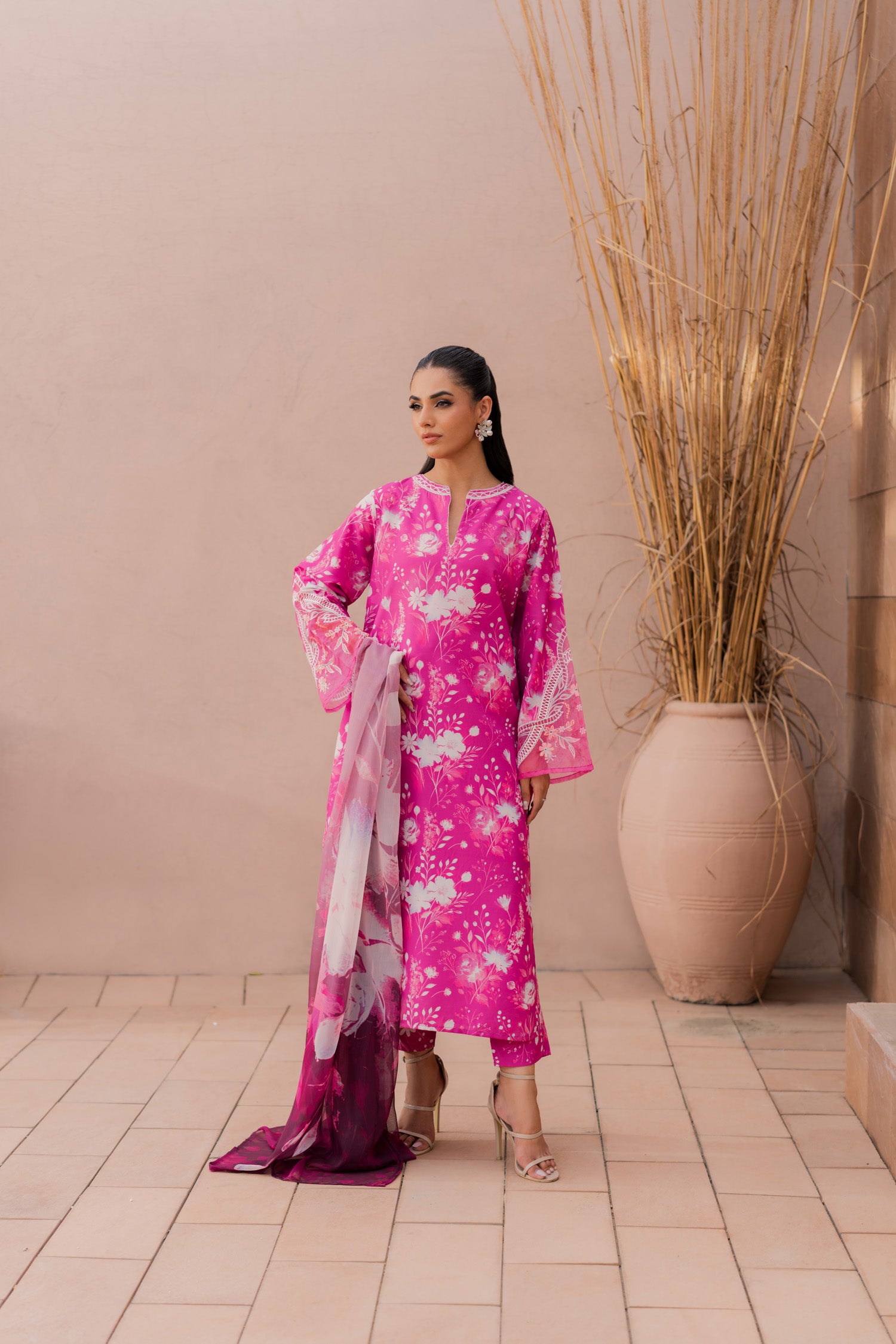 Radiate effortless charm in this pink printed suit, where playful patterns meet graceful style. The vibrant hue and soft fabric make it perfect for casual outings or daytime celebrations. Light, breezy, and full of personality, this suit is crafted for the woman who delights in color and easy elegance.