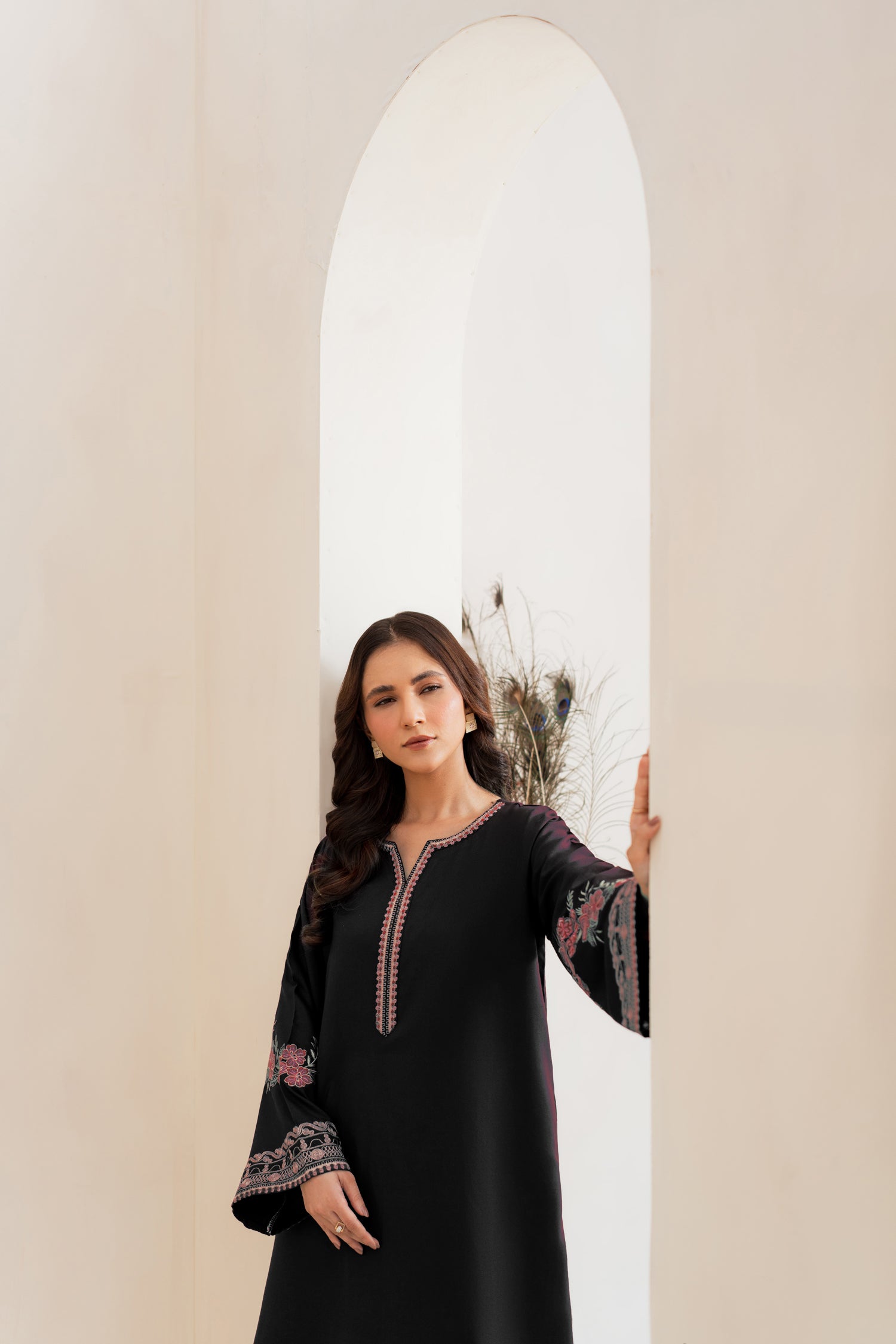 Luxurious black embroidered suit crafted from soft Marina fabric, blending warmth with elegance. Intricate thread work elevates the classic color, making it perfect for winter gatherings. Embrace style and comfort in one stunning ensemble.